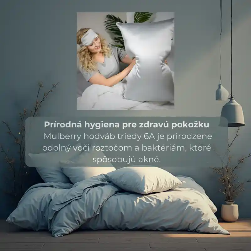 S obliečkou z 100 % Mulberry hodvábu si vaša pokožka udrží rovnováhu vlhkosti, ktorú potrebuje pre prirodzenú ochrannú vrstvu.